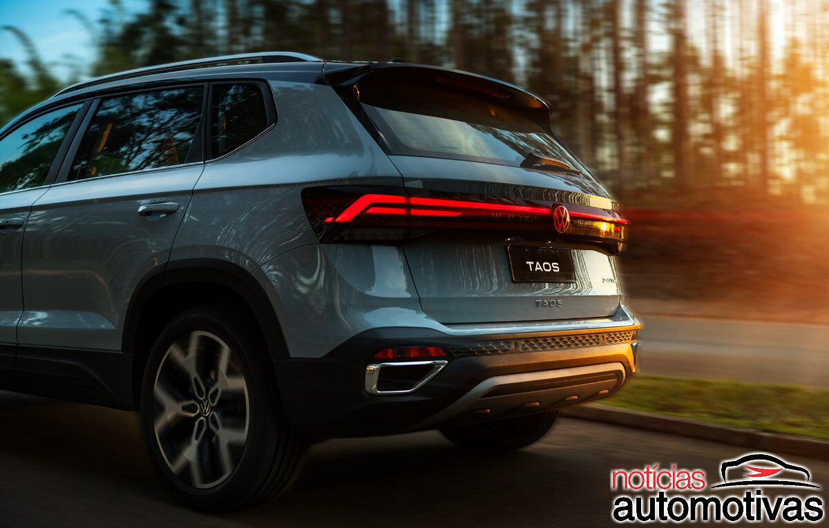 O Taos 2026 é o primeiro modelo do mercado nacional a trazer o logo iluminado na traseira, acompanhado pelo light strip que conecta as novas lanternas. O emblema VW acende em vermelho.