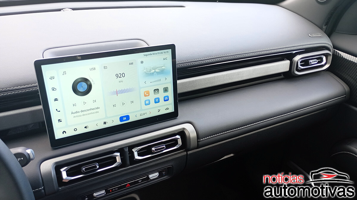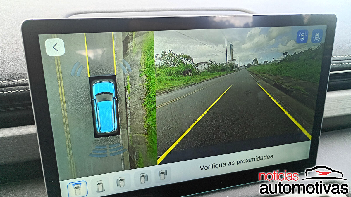 O cluster digital é simples e imita o visual da Tesla devido ao pacote ADAS, enquanto a multimídia tem uma tela um tanto pequena, mas suficiente.