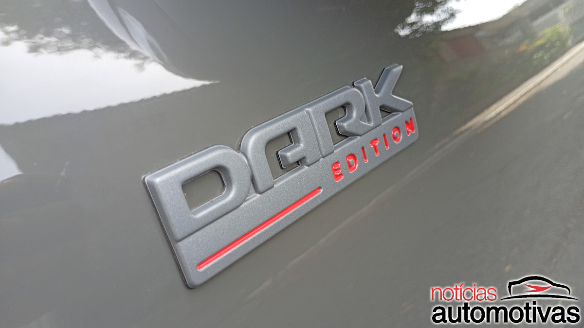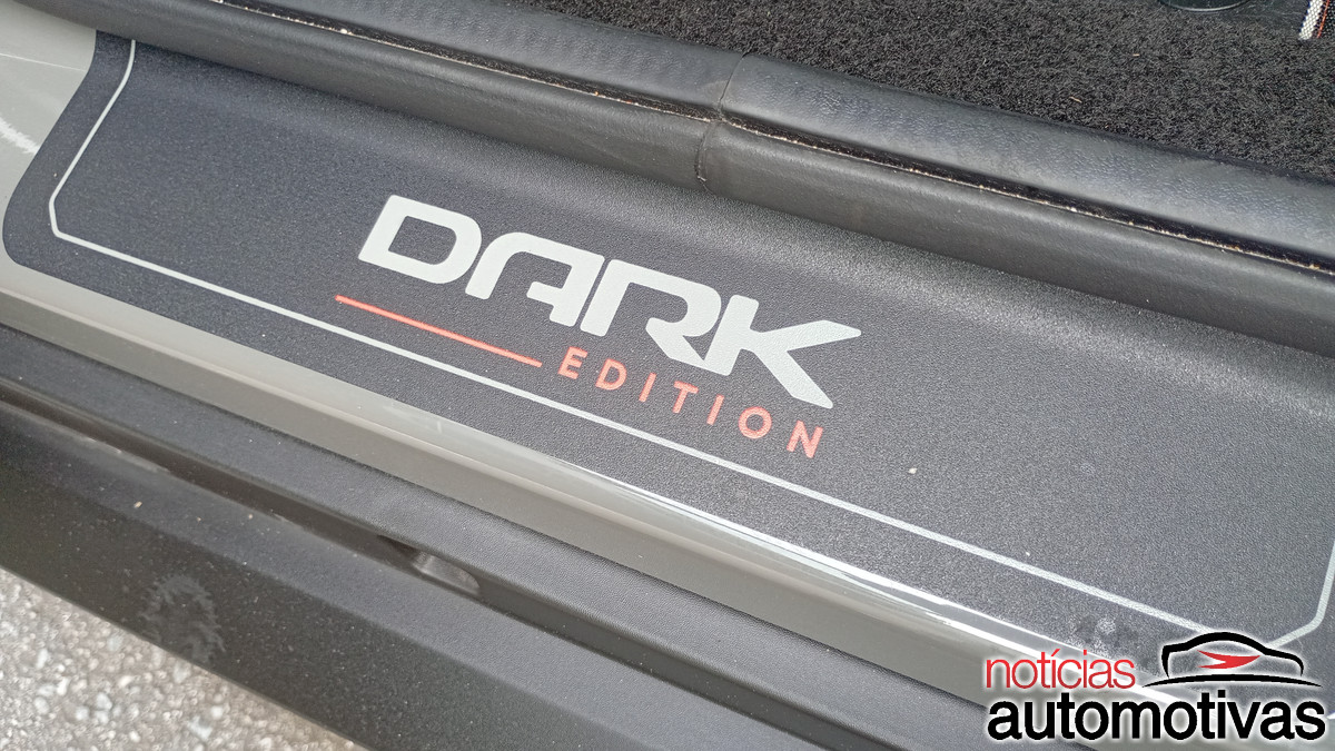 Dentro, o ambiente escurecido contribui para a missão do Dark, assim como pedais esportivos, soleiras exclusivas e os bancos em couro com filetes vermelhos, tendo ainda apoio de braço retrátil do motorista.