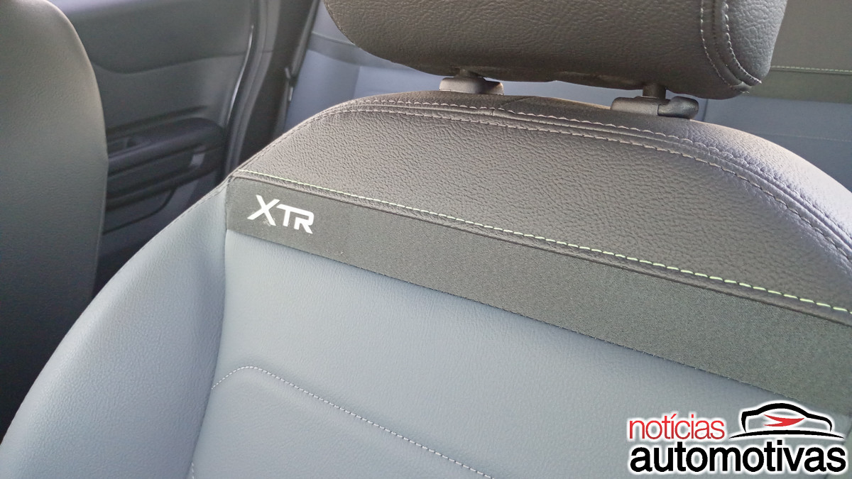 Detalhes em cinza e preto brilhante, inclusive nas portas, bancos em couro em dois tons com a costura verde-limão que se espalha pelo habitáculo, deixam o XTR mais elaborado e atraente.