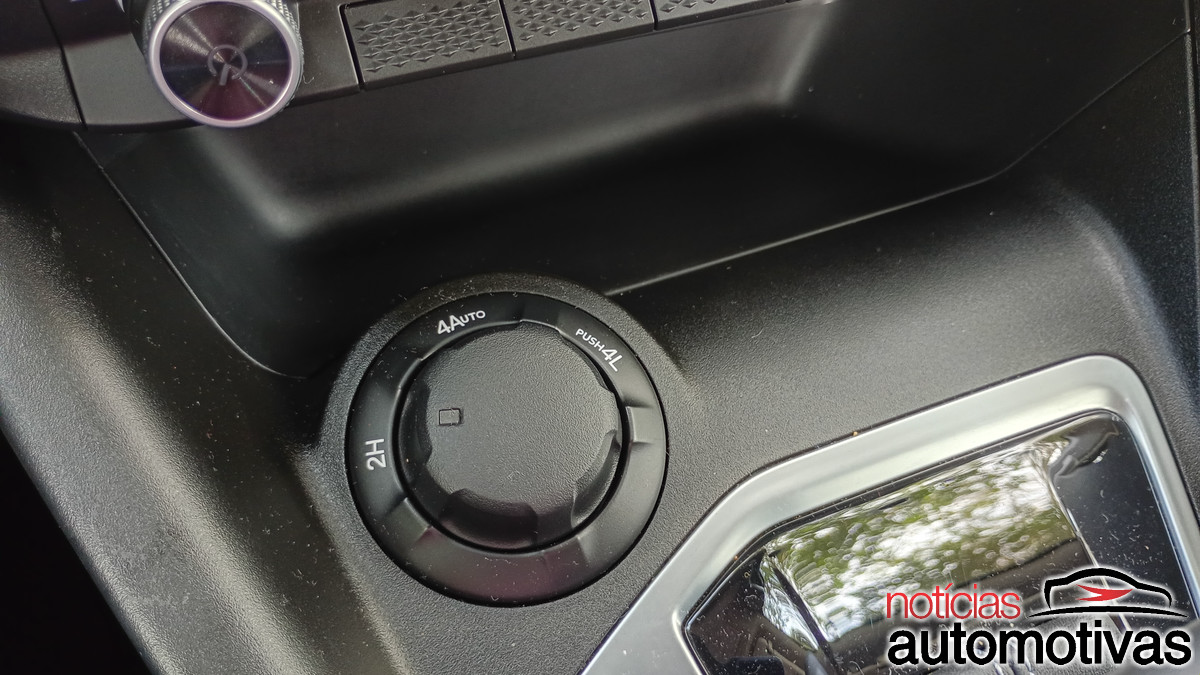 Já o volante é simples, mas atende, enquanto o ajuste de profundidade é comemorado. Com freio de estacionamento eletrônico e seletor automático de tração, a Titano 2026 tem uma alavanca de marchas eletrônica e vistosa.