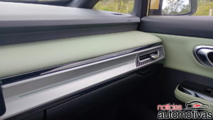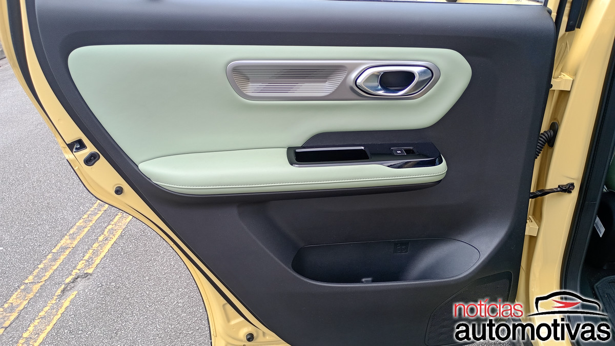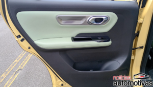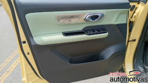 Embora a pintura seja um tom pastel de amarelo, dentro o que reina é o verde, assim como o amarelo no volante. Homenagem ao Brasil, certamente. Detalhes metalizados ajudam, assim como revestimento soft nas portas e painel.