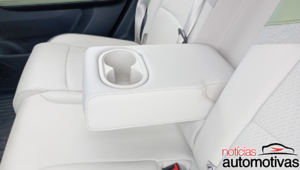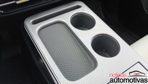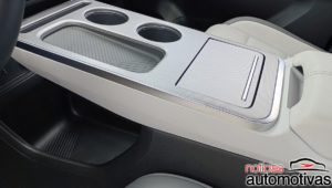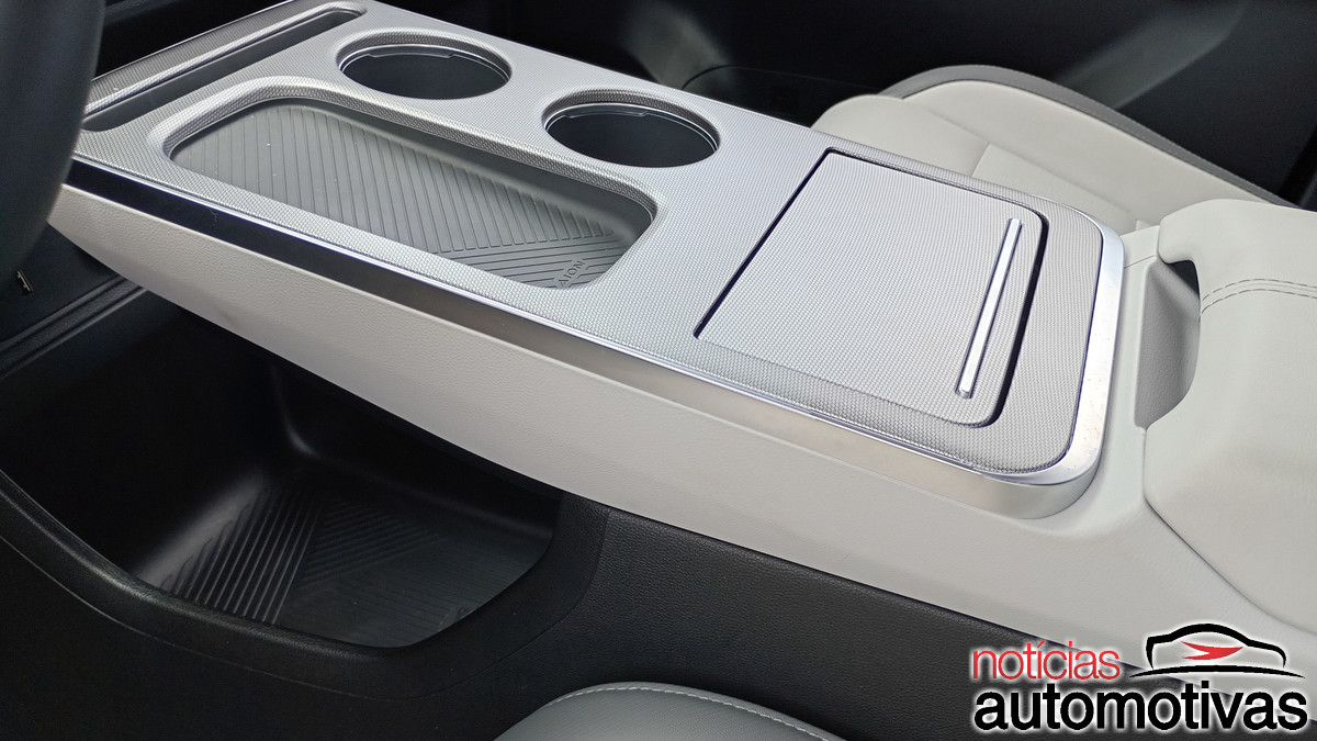 O console cortado com um grande porta-objetos amplia a sensação de se estar numa minivan, com direito a slot para celular, porta-copos e mais dois porta-objetos. O volante minimalista e as duas telas de cluster e infotainment estão de acordo.