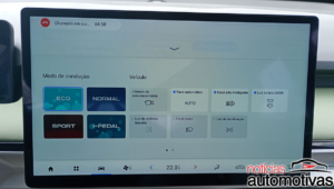 Nele existem os modos Eco, Normal, Sport e I-Pedal, com o primeiro realmente cortando muito da energia nas saídas e respostas, mas mesmo assim, ainda supera muitos SUVs até mais potentes, já que tudo é entregue quase de uma vez.