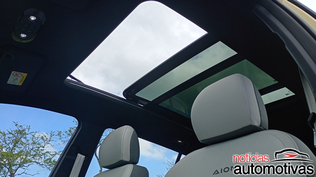 Oferecendo boa área envidraçada, o Aion Y tem traseira com luzes unidas por uma barra de luz e um visual limpo, como na frente, enquanto o teto tem um vidro panorâmico que abre e as rodas aro 18 com pneus 215/50 em cinza se harmonizam com as saias de rodas.
