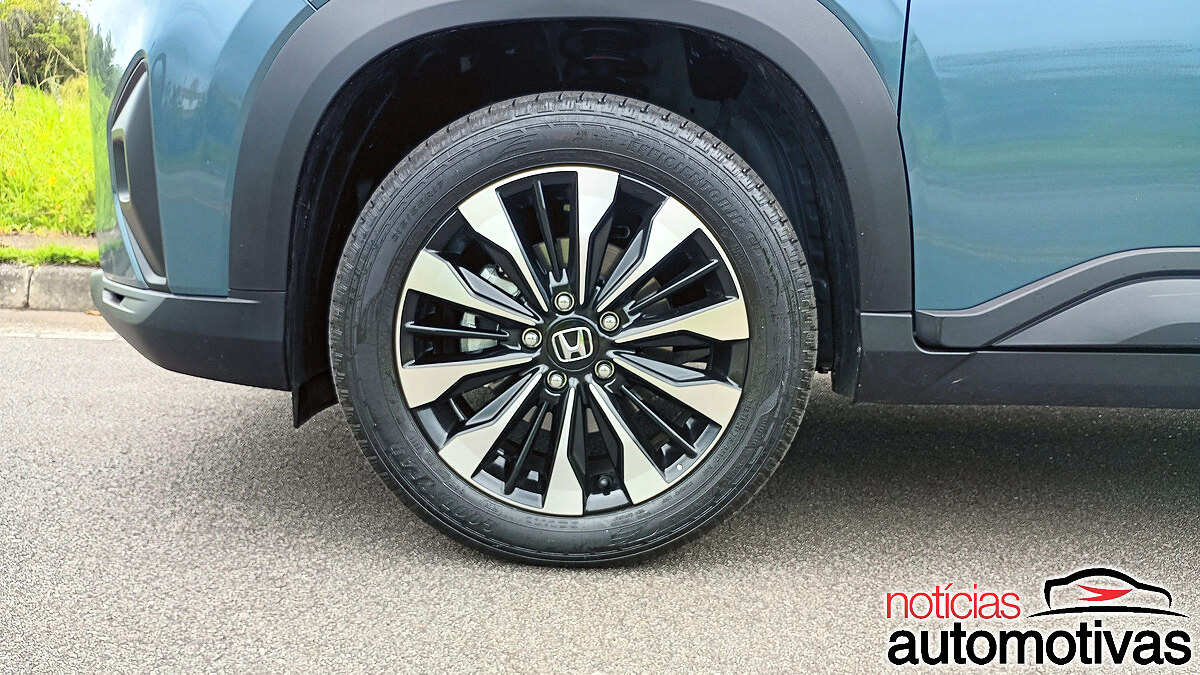 Com rodas de liga leve aro 17 polegadas e pneus 215/55 R17, o Honda WR-V tem ainda boa altura de suspensão e retrovisores grandes, que ajudam muito nas manobras.