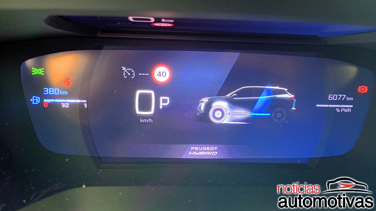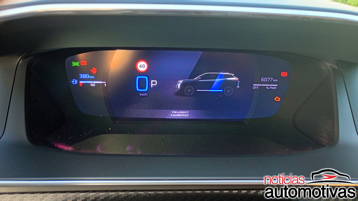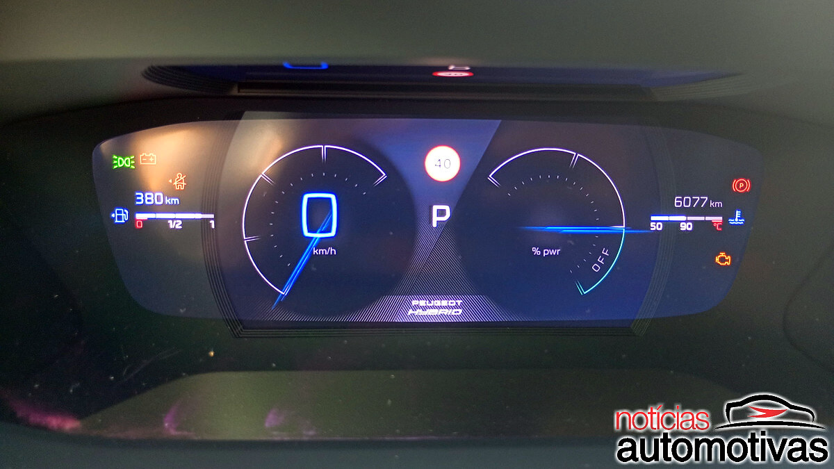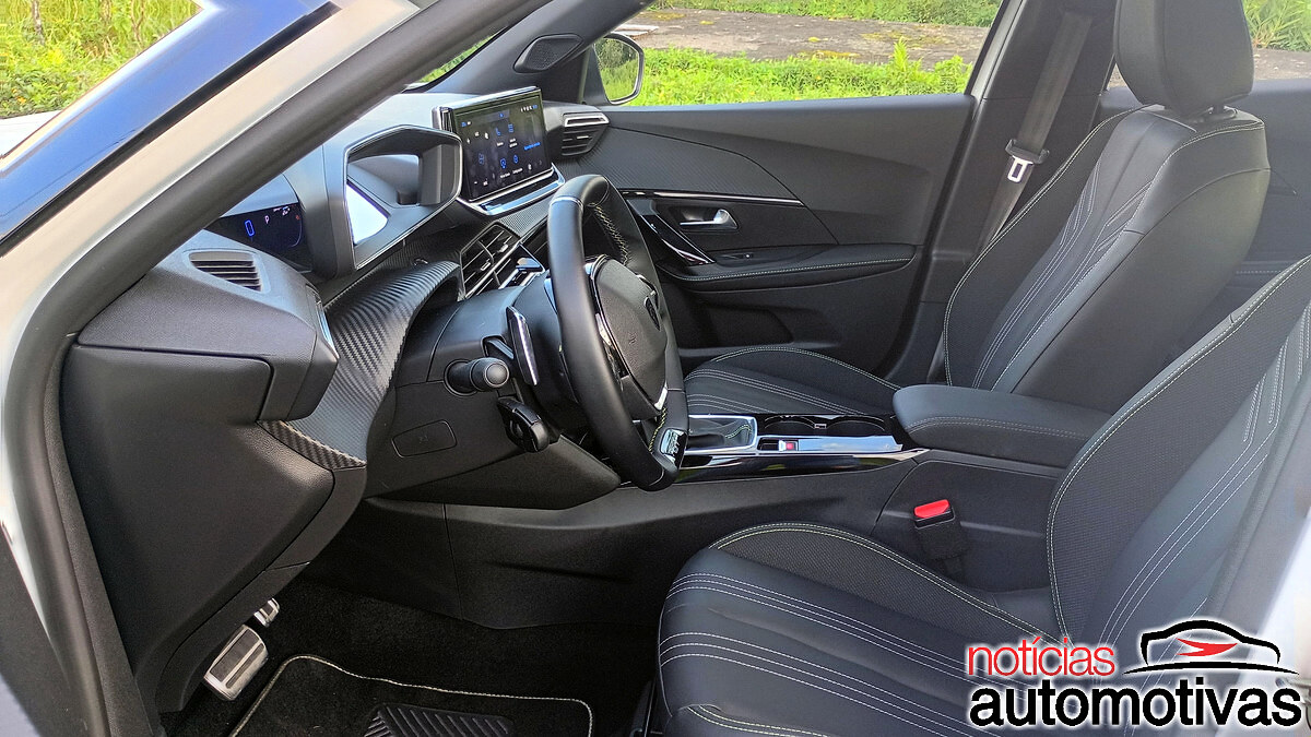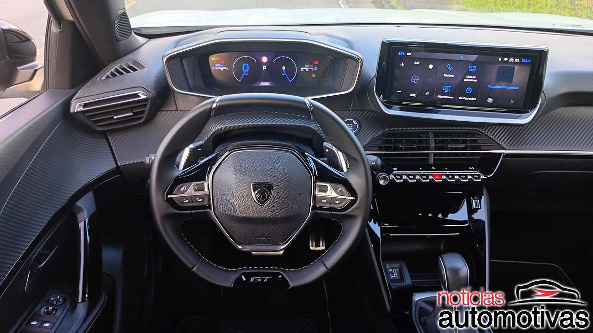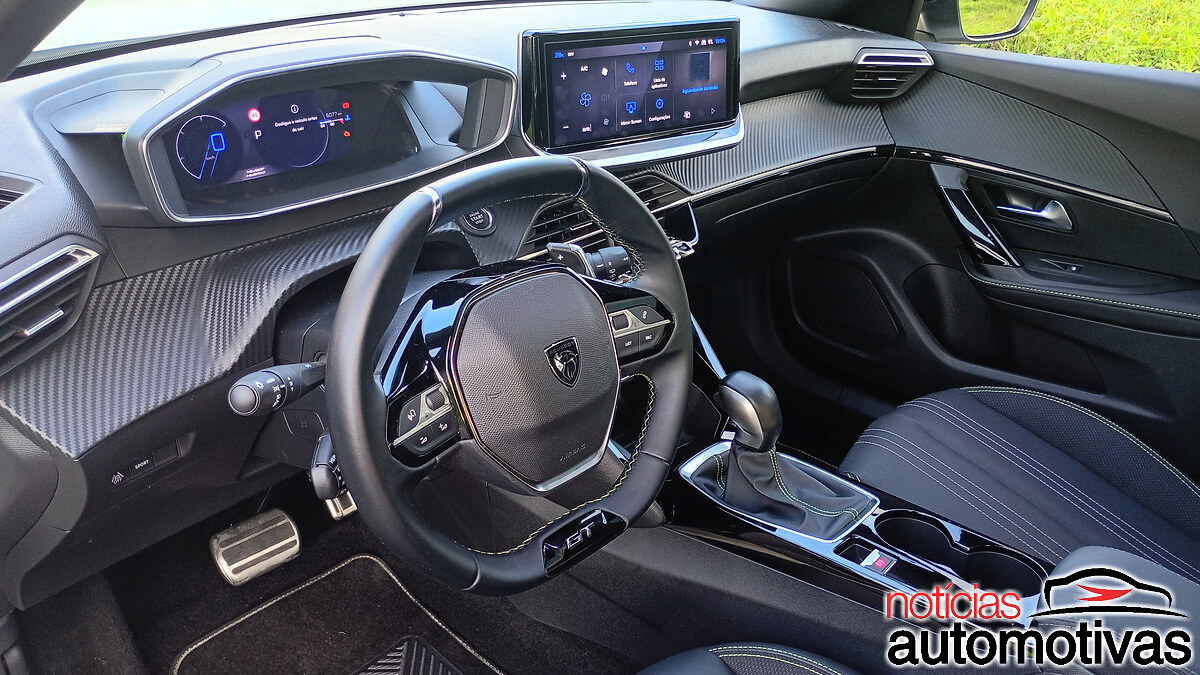 Dentro, o habitáculo escurecido dá destaque para o i-Cockpit da Peugeot, com o volante em couro ovalizado e logotipo GT, o mesmo visto nas laterais do exterior, bem como paddle shifts fixos.