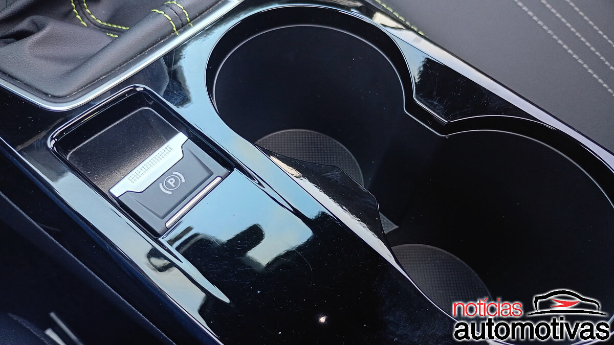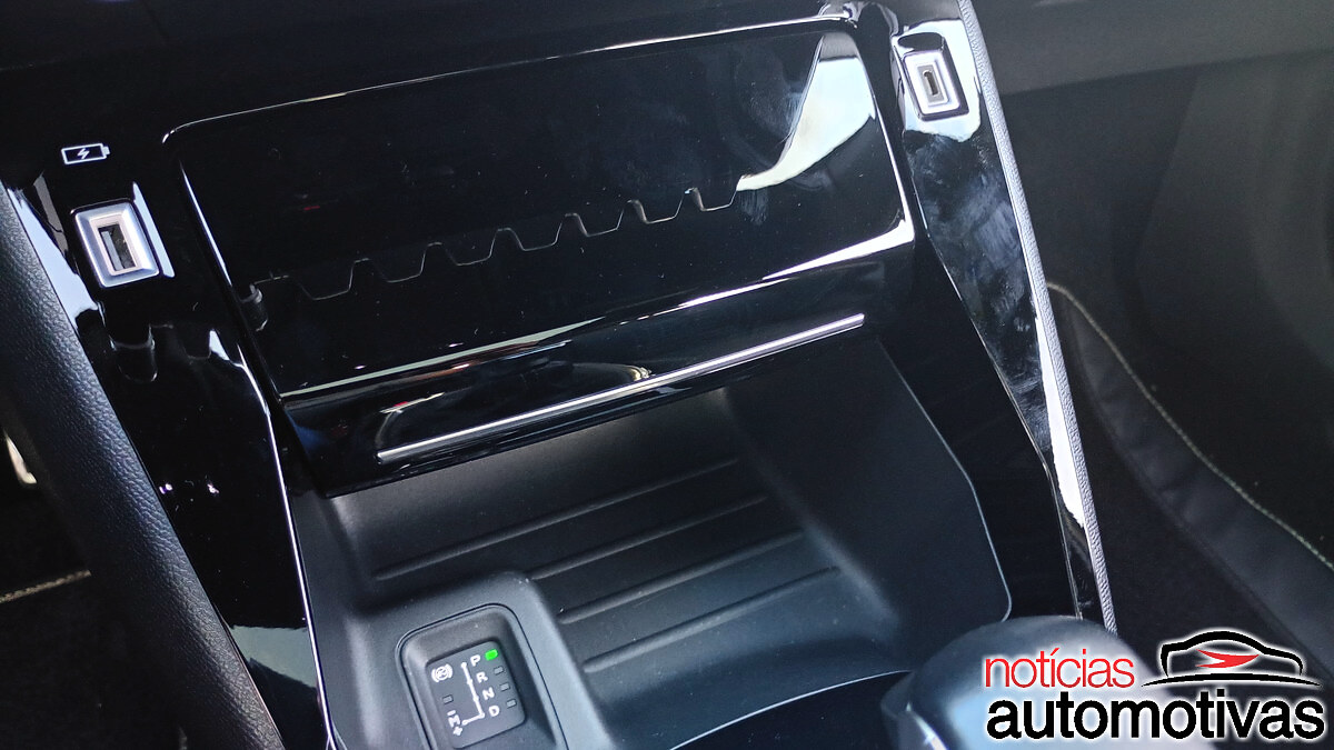 O slot com recarga indutiva de smartphone mantém sua tampa em preto brilhante, enquanto o acabamento superior imita fibra de carbono.