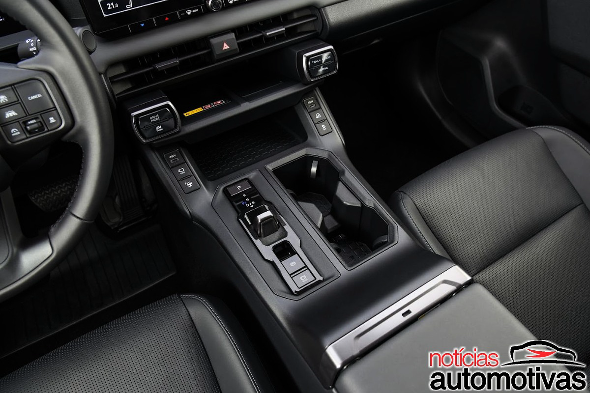 No RAV4 2026, existem os modos de condução Normal, Eco, Sport e Custom, bem como as funções Trail e Snow. O modo EV permite rodar sem uso do motor.