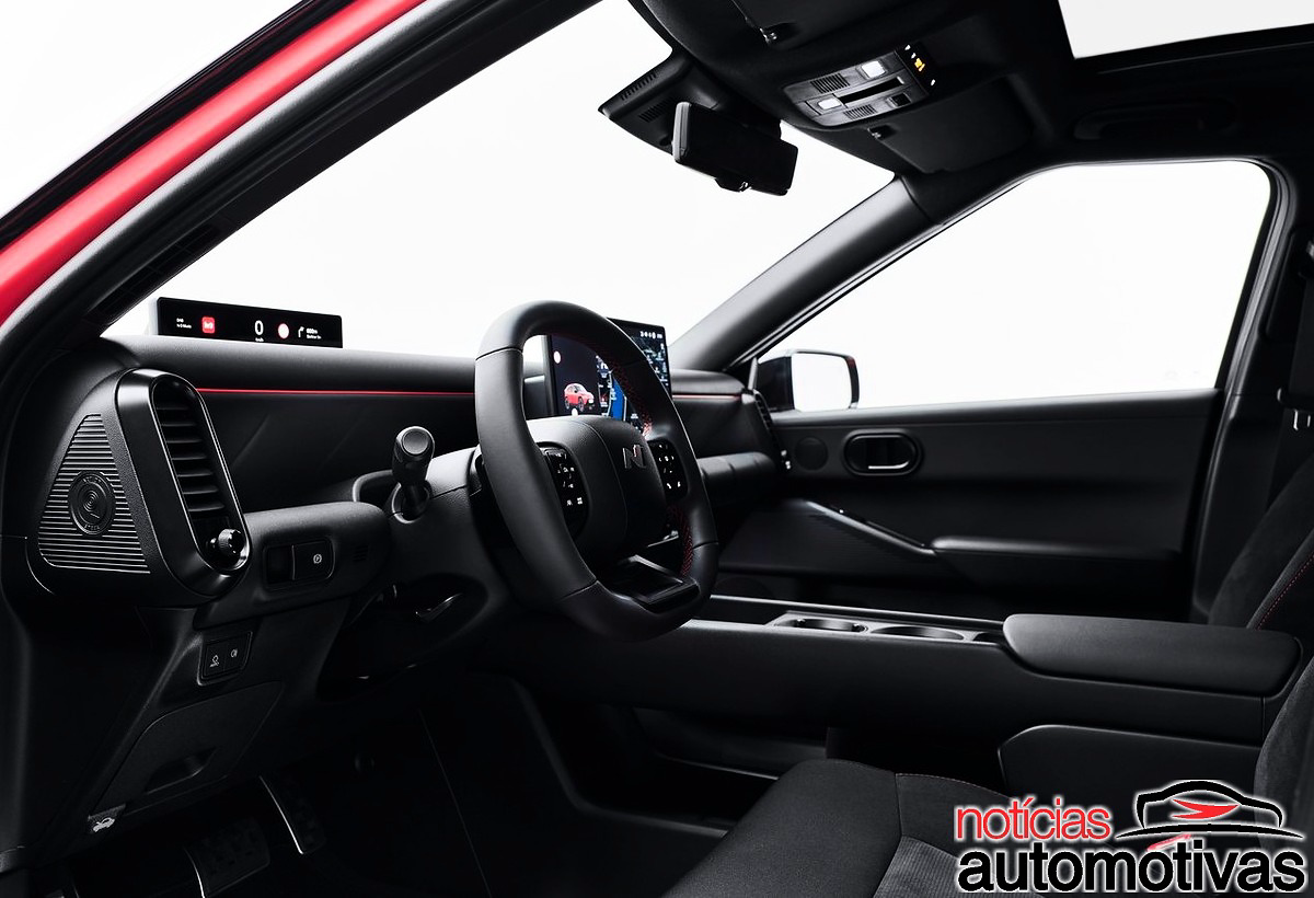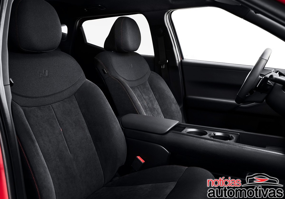O console central é alto e tem elemento vazado, bem como cabine com teto solar panorâmico e difusores de ar traseiros, entregando na versão N, volante esportivo ovalizado e bancos em camurça, dando um ar mais sofisticado ao Ioniq 3 N, que mede 4,17 m contra 4,15 m das demais versões.