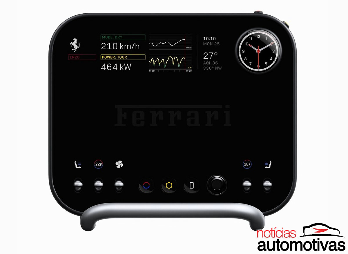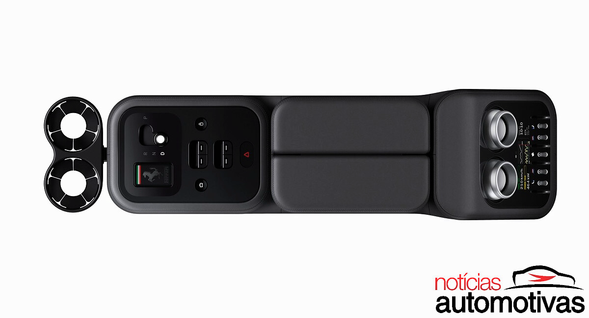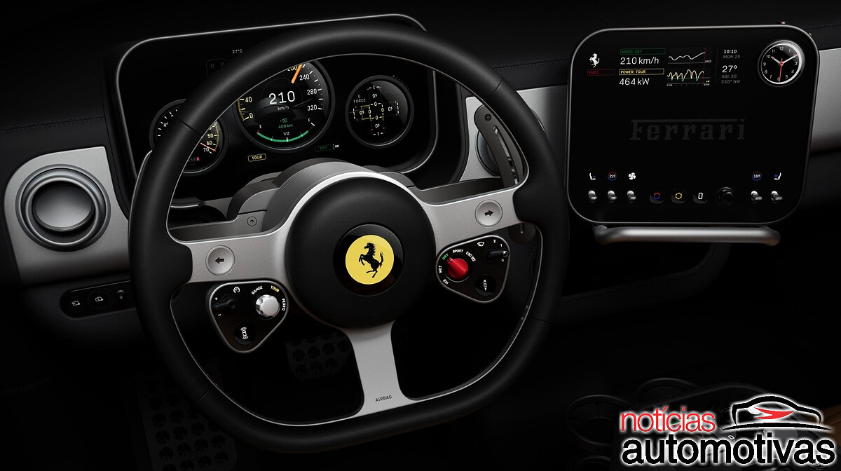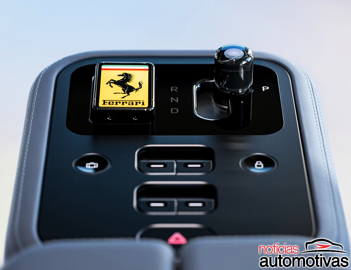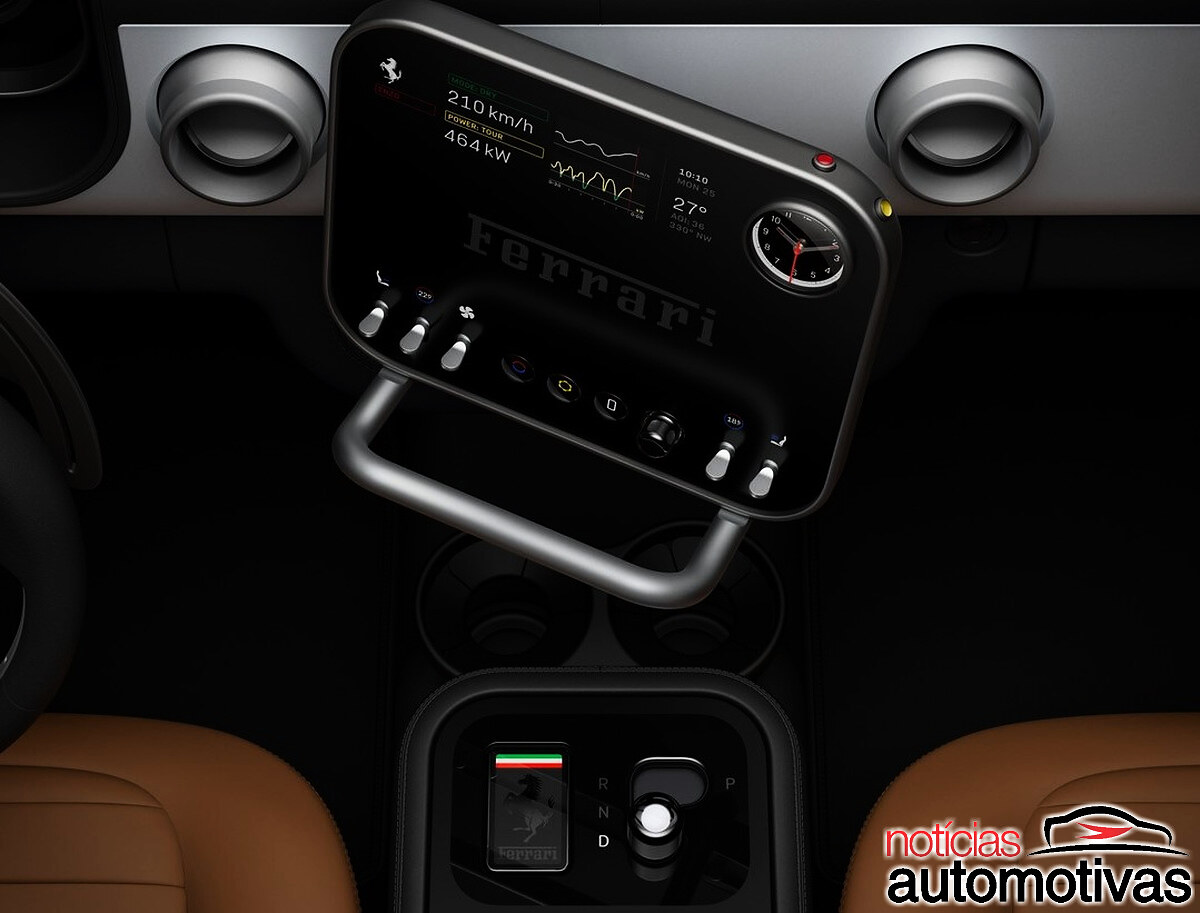 A multimídia se apresenta como o cluster, num formato de painel quadrado que se encaixa na estrutura do bólido da Ferrari, enquanto o console de marchas também é bem compacto e segue o mesmo estilo minimalista.