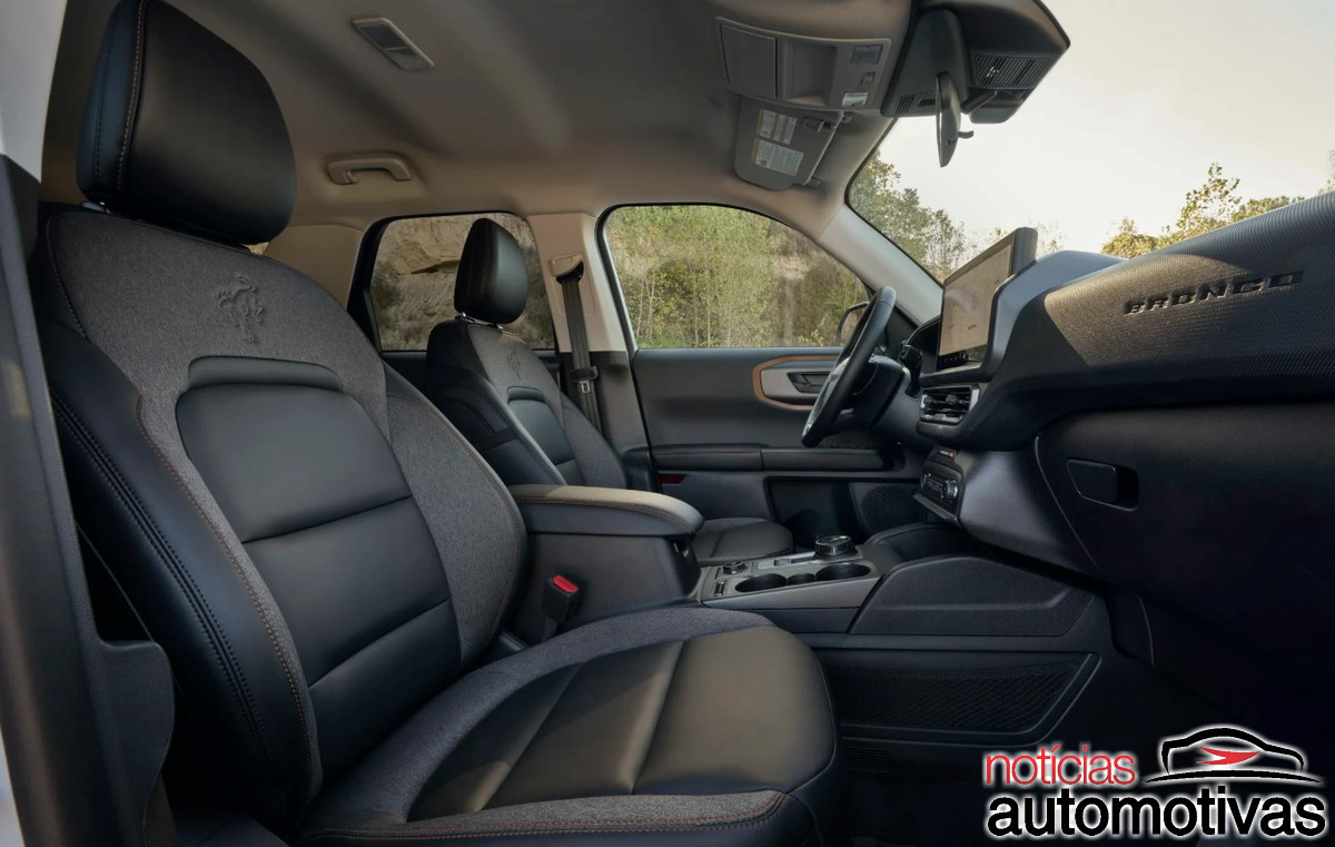 Por dentro, o Bronco Bronze Package conta com a tonalidade no painel de instrumentos e ao redor das saídas de ar, bem como nos painéis das portas, tapetes para todas as condições climáticas e protetor do porta-malas.