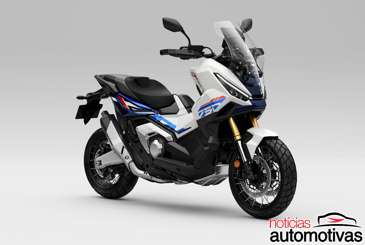 A big scooter aventureira X-ADV com câmbio DCT ganhará a partir de 5 de março, no Japão, a cor “Matte Pearl White” com grafismos tricolores, detalhes dourados nos tubos externos da suspensão dianteira e prateados na balança traseira.