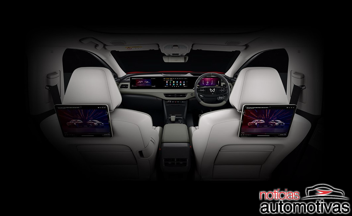 O ambiente é altamente digitalizado com painel tendo três telas digitais, assim como telas de entretenimento na segunda fileira, alto-falantes no teto e inteligência artificial.