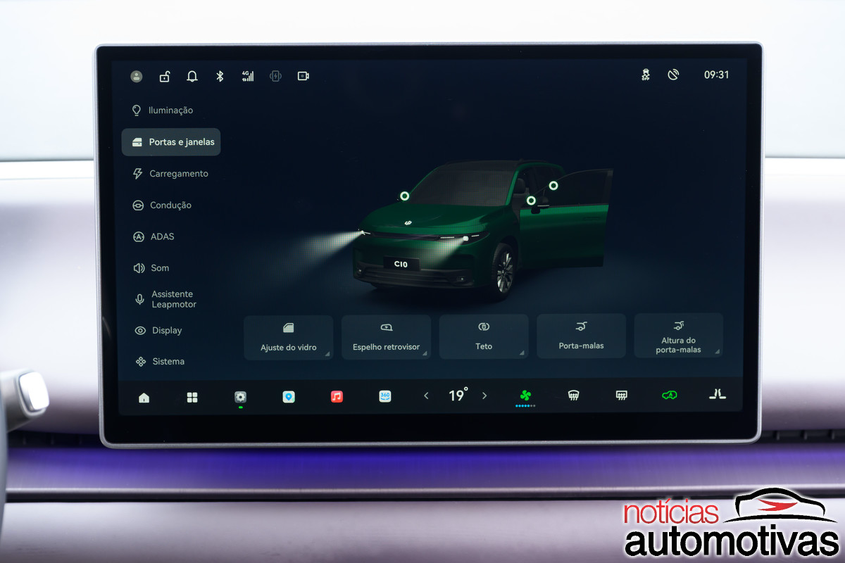 Com acesso por um exclusivo cartão NFC, o interior do Leapmotor C10 oferece painel com cluster digital e multimídia Leap One de 14,6 polegadas, com modos de condução, energia, climatização, áudio e cenários personalizados.