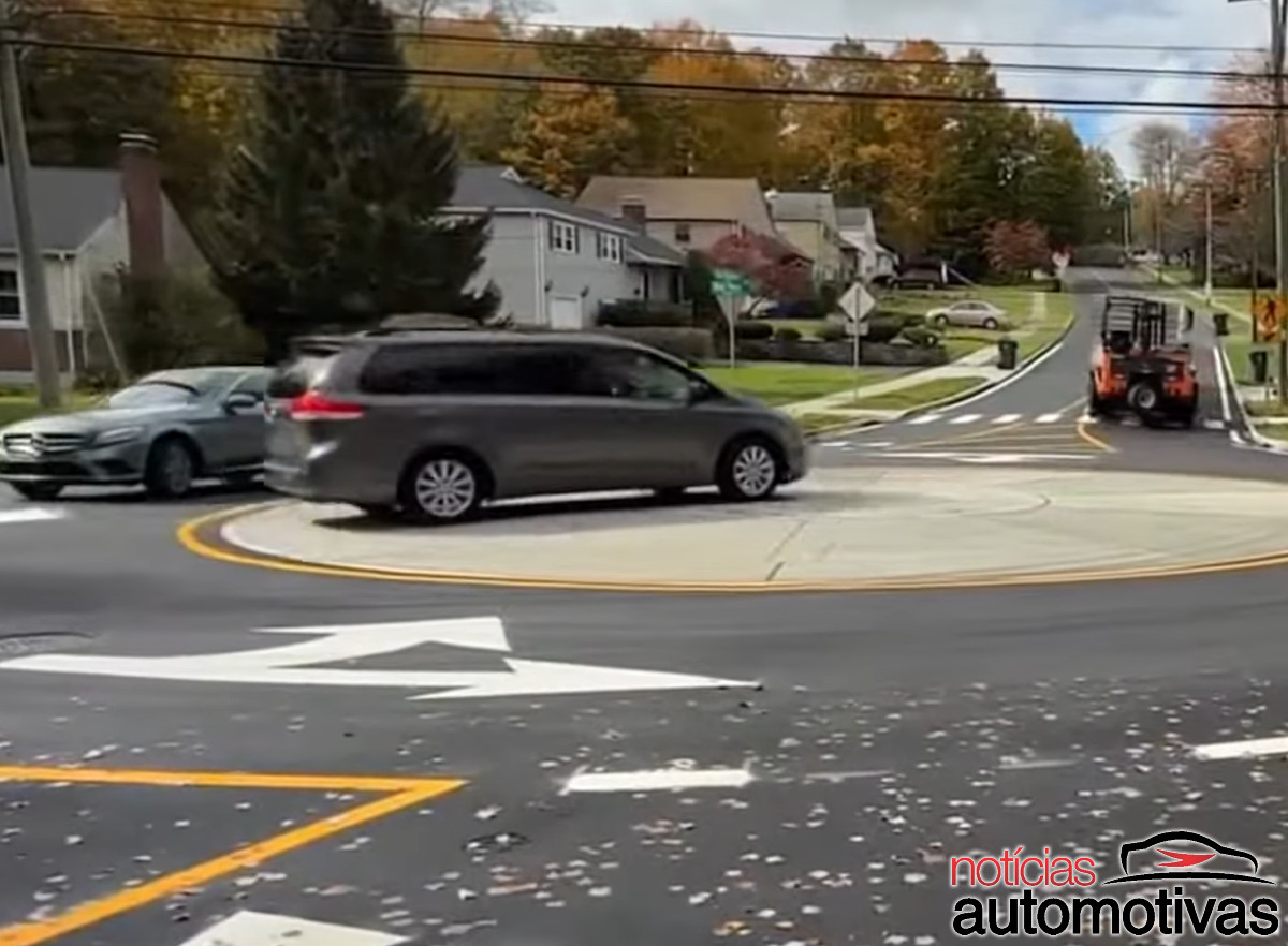 A emissora NBC Connecticut flagrou um Volkswagen passando reto sobre o centro da rotatória como se fosse um trecho contínuo de asfalto — sem sequer reduzir a velocidade.