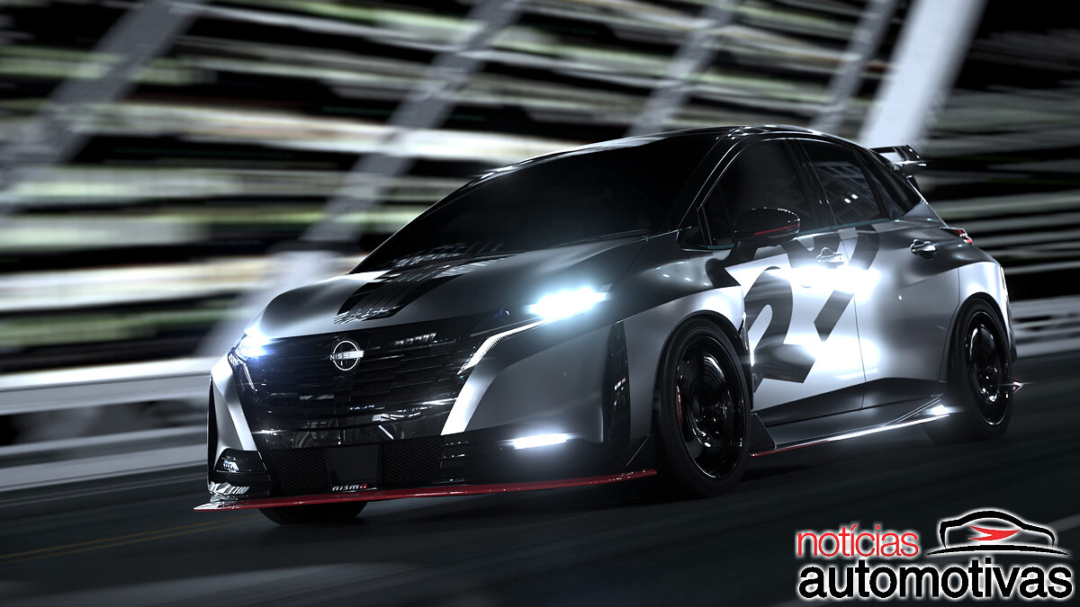 O design exterior evolui o conceito “Agile Electric City Racer” do Aura Nismo, optando por um estilo mais robusto e focado em desempenho, com superfícies angulares.