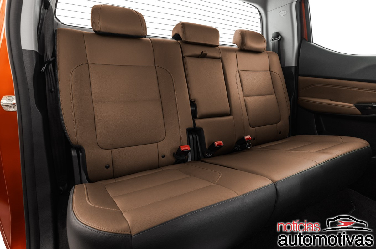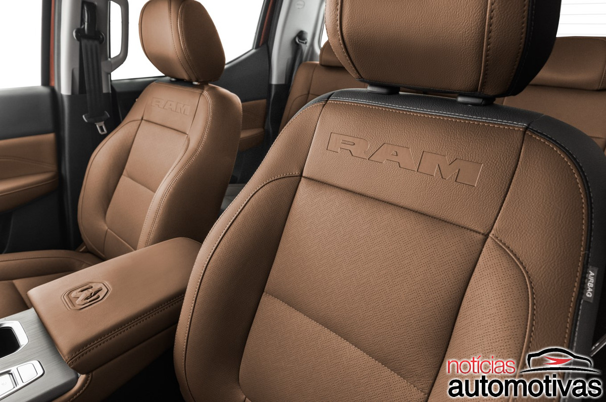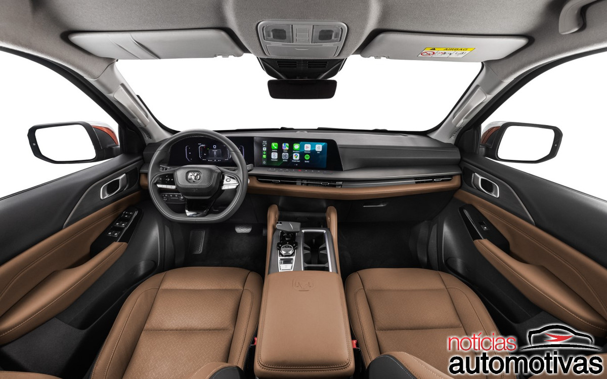 O interior da versão Laramie tem bancos com revestimento de couro premium no tom marrom, material que também reveste os painéis de porta e de instrumentos, que contam com materiais macios ao toque.