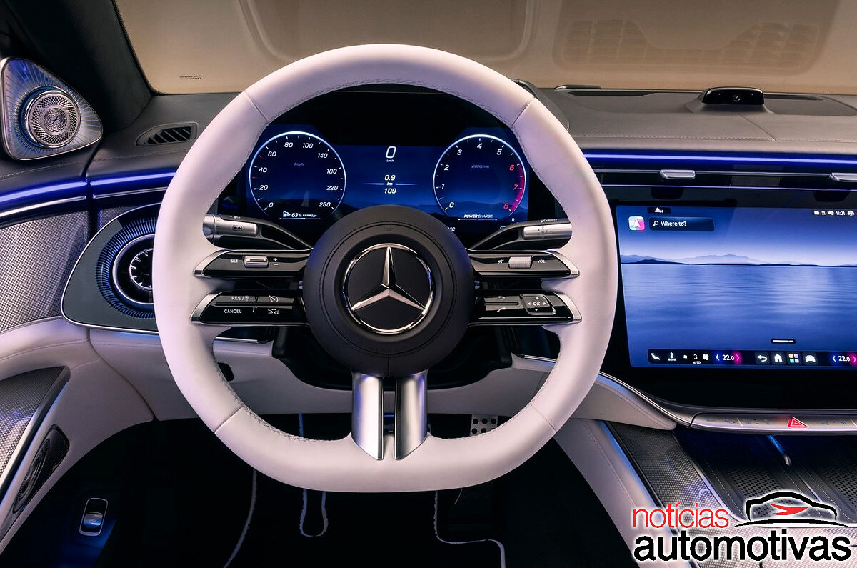 Dentro, o sedã de alto luxo da Mercedes tem um novo Sistema Operacional Mercedes-Benz (MB.OS), com MB.Drive e o MBUX.
