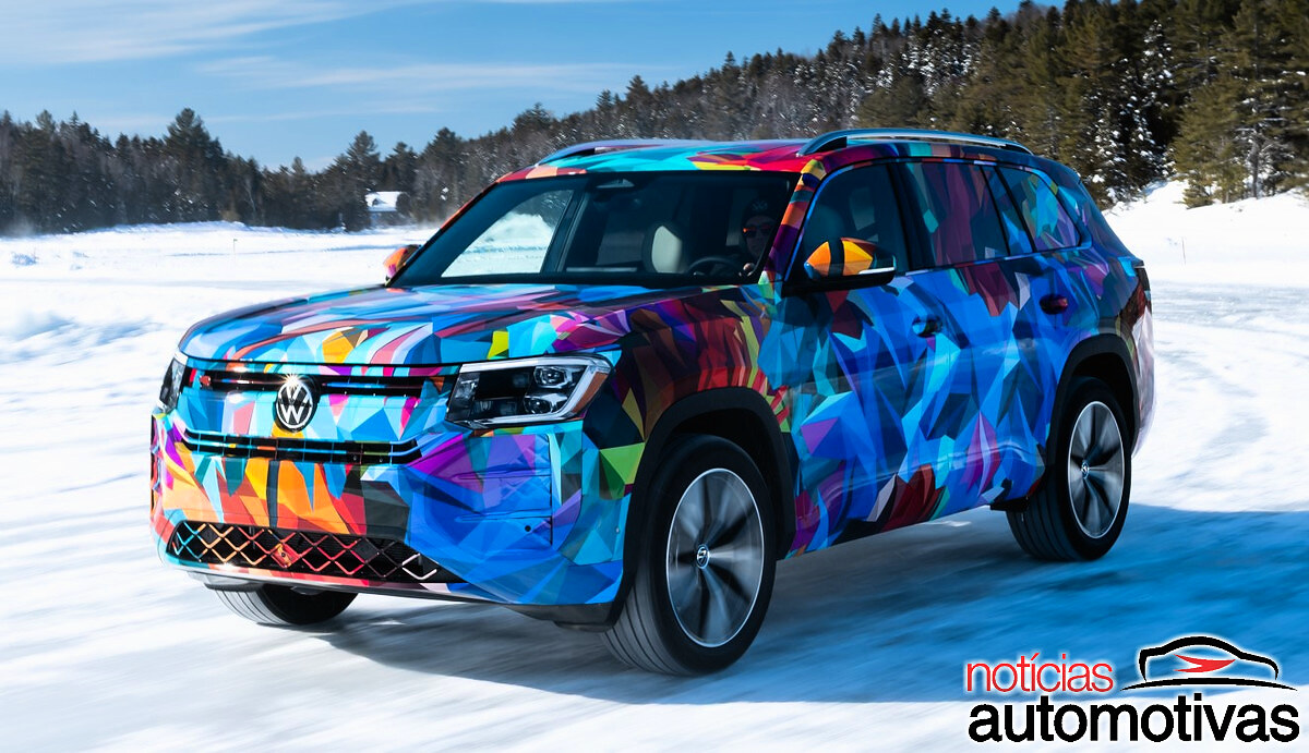 Sob camuflagem colorida, o Novo Volkswagen Atlas apresenta novos faróis full LED verticalizados e uma grade dividida por uma espessa barra com o logotipo VW, que não parece iluminado.