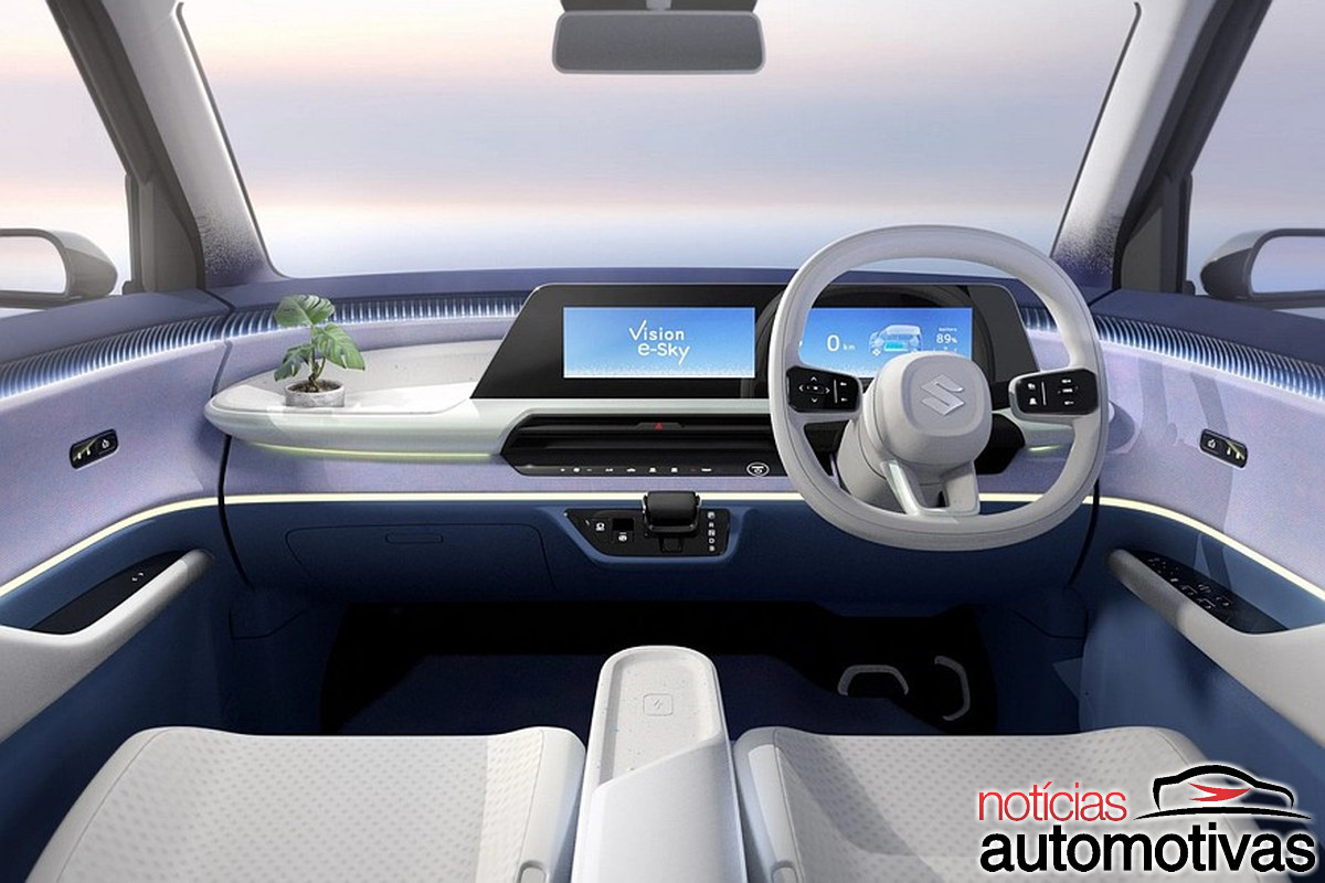 Dentro, o Suzuki Vision e-Sky tem um ambiente construído em materiais reciclados, com acabamento claro e um painel dotado de duas telas digitais para cluster e multimídia, mais uma plataforma para objetos e até um porta-planta.