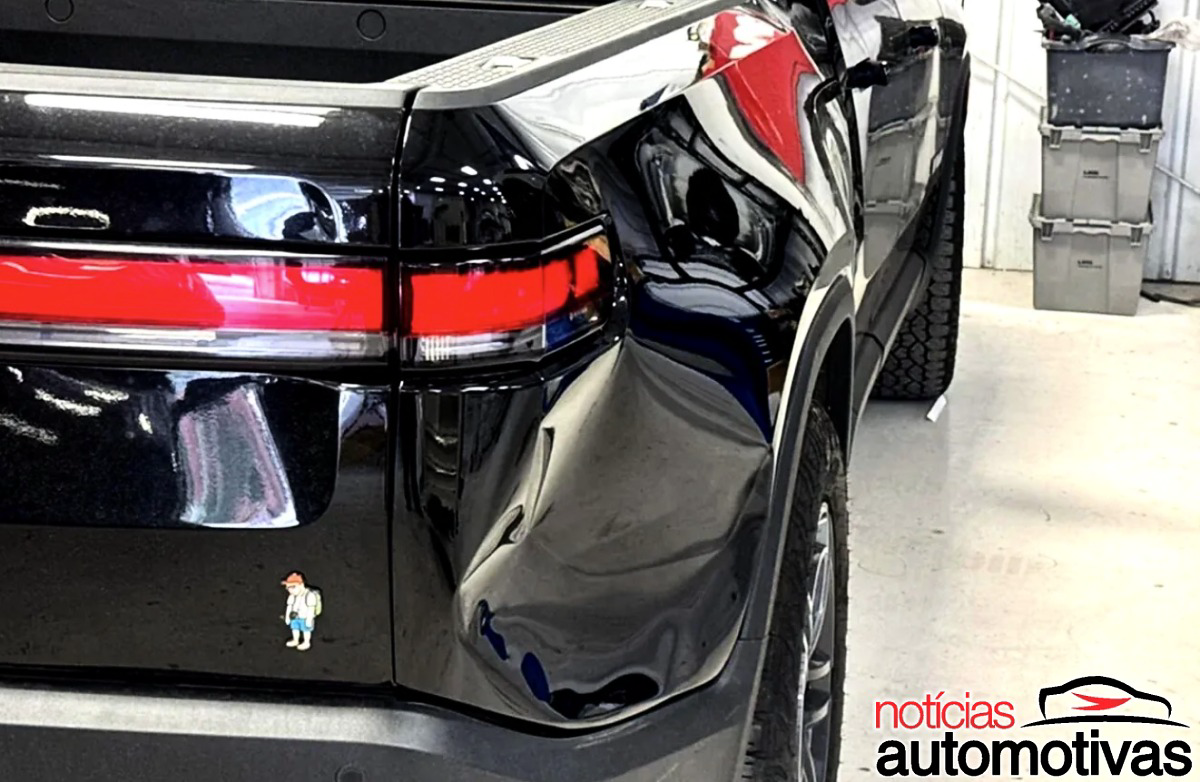 À primeira vista, o problema nessa Rivian R1T preta não parece tão extremo, porque o impacto ficou concentrado basicamente em uma única área da carroceria.
